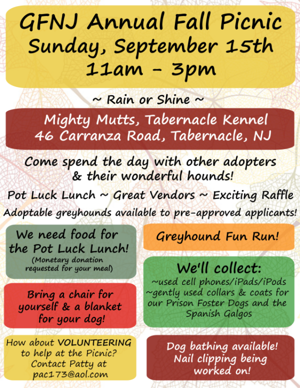 Sunday September 15th, 2019 11:00 AM until 03:00 PM Location: Pineland Country Kennel, Tabernacle, NJ (609) 268-5700