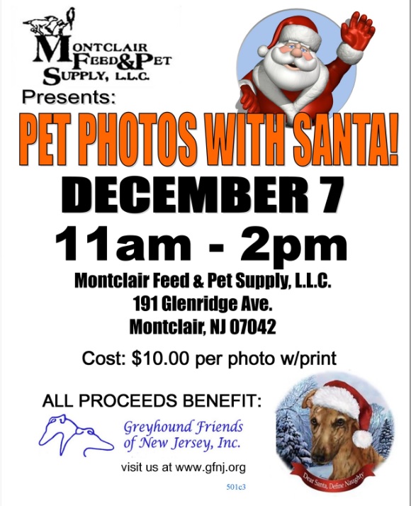 Have your pet photo taken with Santa at Montclair Feed & Pet Supply! Cost is $10.00 per photo with print - all proceeds to benefit GFNJ!